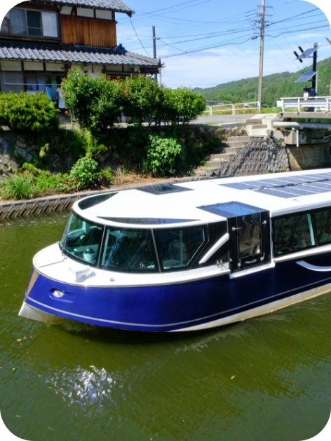 東京海洋⼤学さまと産学共同で電池船の開発に取り組んでいます。2025年⼤坂万博、福井県や沖縄県の観光船として、当社の製作した制御システムが運⾏しています。