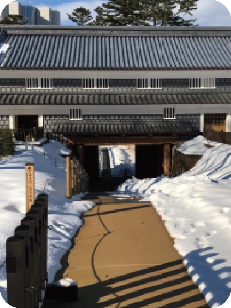 金沢城公園内にはたくさんのロードヒーティングが観光客の足元を確保しています。また、鼠多門を観光客が通行する際、屋根からの落雪がないように、通路部分に相当する鉛瓦葺屋根の中にも当社が施工した電気ヒーターが設置されています。観光客へのおもてなしの一環として役割を果たしています。